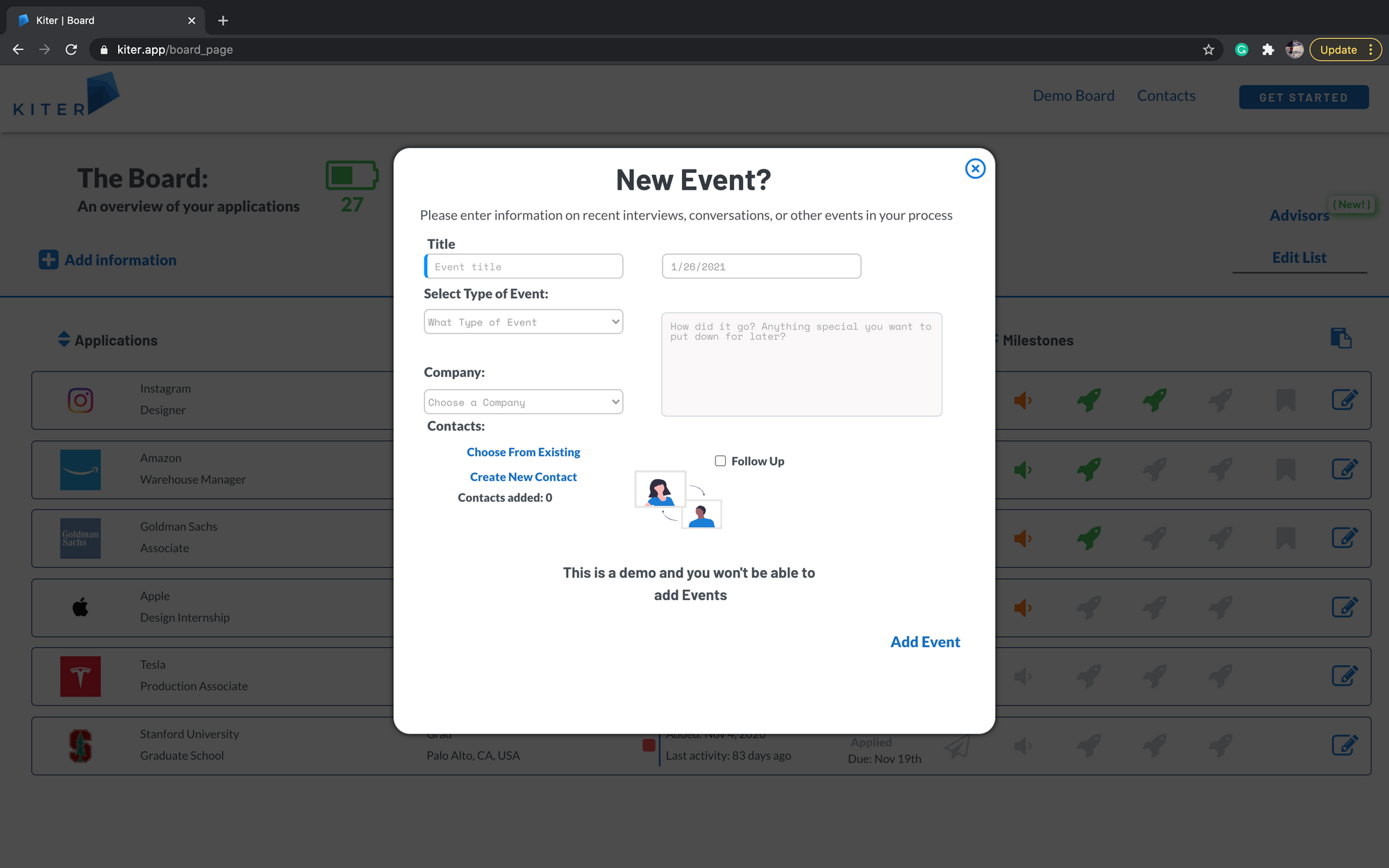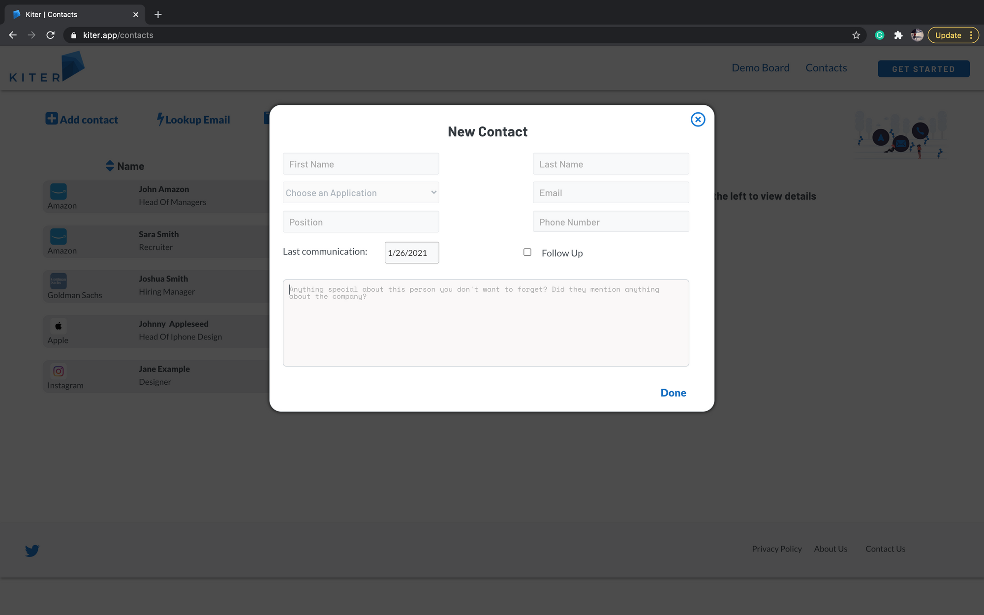 Kiter is a platform that helps our users reach their dream job or school. We make tracking applications and interviews fast, effective and fun with tools designed to help everyone steer towards their next adventure.