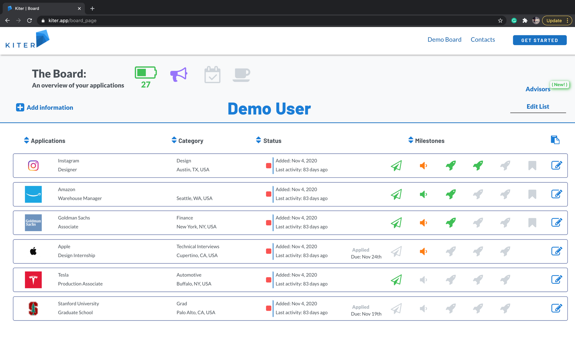 Our users turn their list of companies that they are interested in or have applied to into an interactive dashboard to help chart their path forward. We believe action and accountability should be easy to achieve and we provide an experience that saves our users time getting organized. This makes the whole process more enjoyable and our most common feedback from excited users is that they wish they had discovered us earlier!