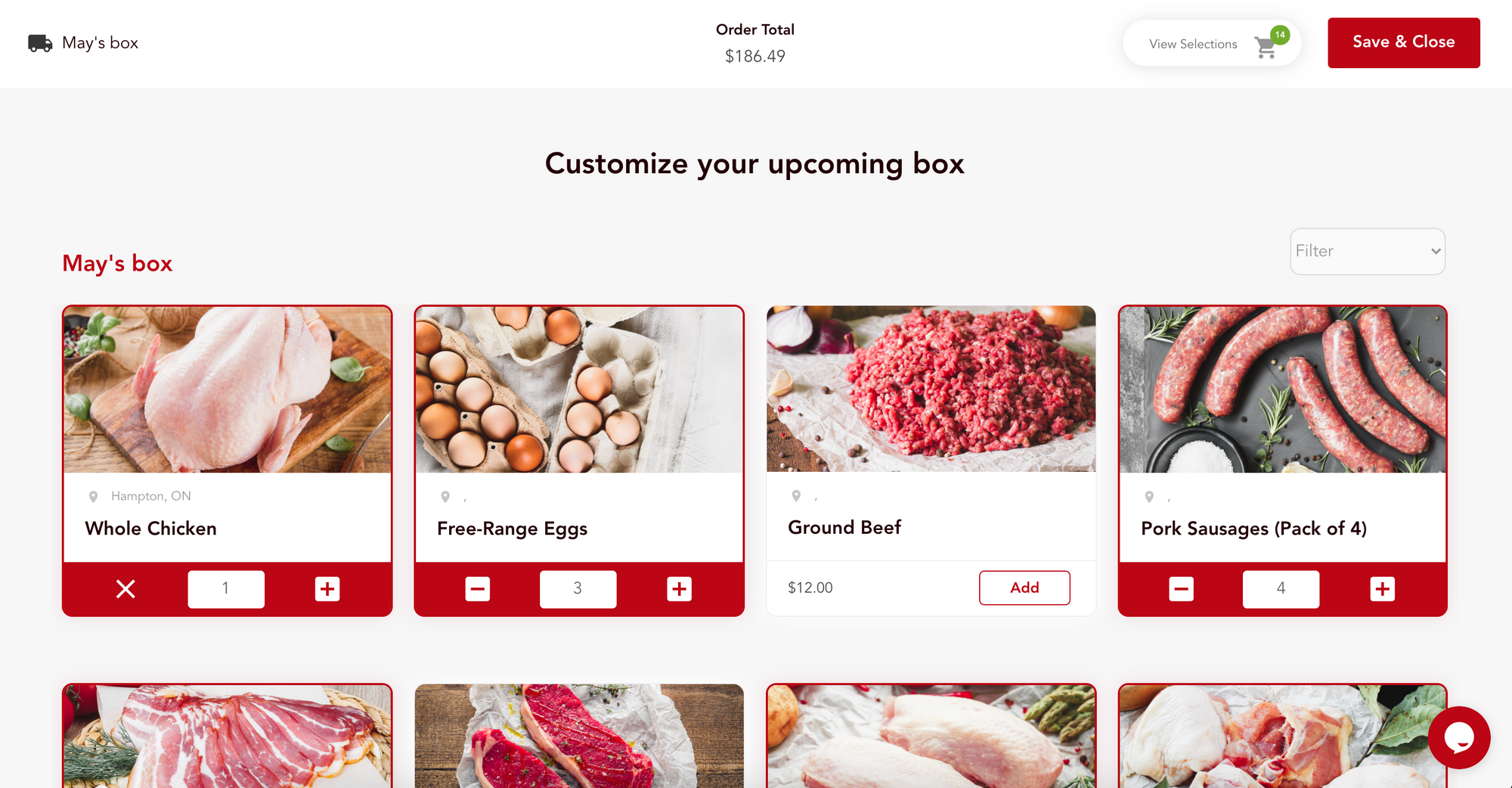 Our app is a customizable monthly subscription solution for our grass-fed, naturally-raised meats and fish business. This includes a front end ordering system, Stripe payment integration, a user account dashboard wherein the user can manage their subscription status and monthly box selections, as well as an admin dashboard where we can manage orders, customers, analyze LTV, product counts, and more.
