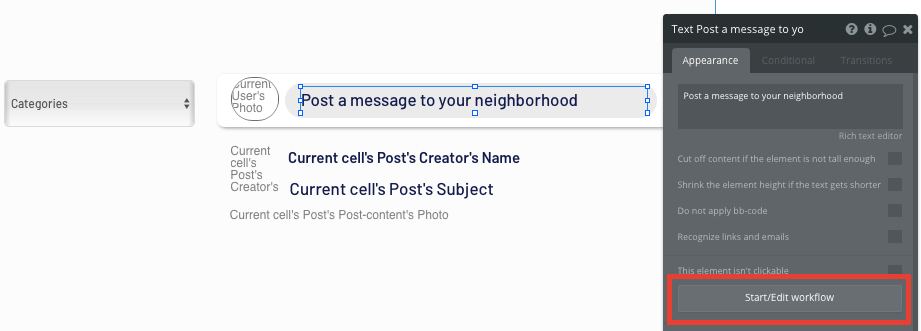 This workflow will follow a familiar structure to the profile editing function, only this time, you’ll want to create a new thing within your database when the post button is clicked.