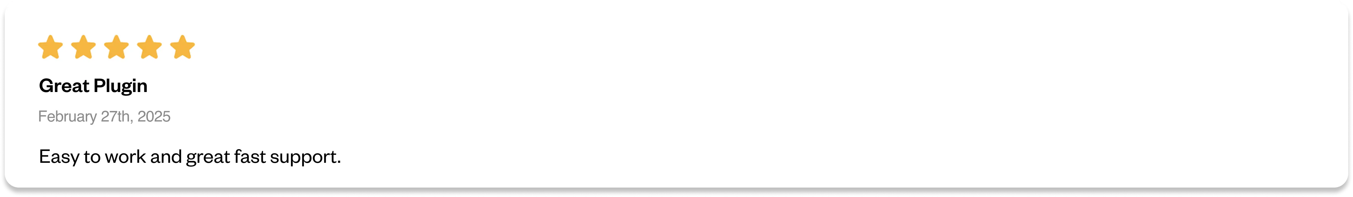 Greetings, It’s Anton, from the Zeroqode Support Team. We're grateful for your warm review and are delighted to bring joy to our users. Our lines are always open if you have any questions or suggestions. You can contact us on our forum (https://forum.zeroqode.com/) or directly at [email protected]. In case you find some issues without plugins, please fill out the form at https://issues.zeroqode.com and we will get back to you Again, thank you for the review. Best Regards, Anton