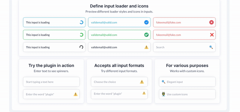 You can add a spinner or icon to your input by selecting the desired option in the plugin settings. You can choose between a built-in spinner or upload your own custom icon.