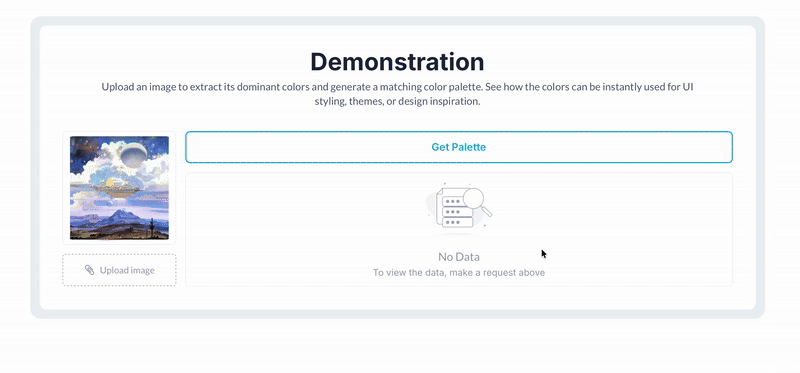 Use the “Get Color Palette” data call, passing in the necessary image data. The API will return a range of colors extracted from the image, providing a ready-to-use palette.