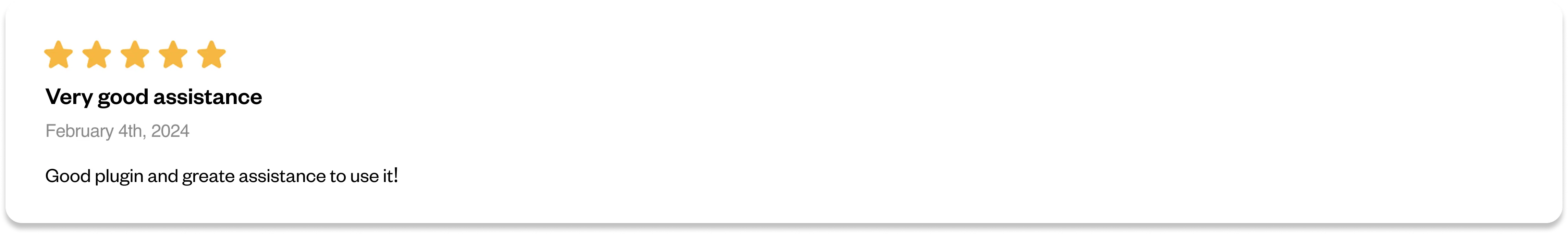 Hello, It’s Anton, from the Zeroqode Support Team. We want to extend our heartfelt thanks once again for taking the time to leave a review. Your feedback is invaluable to us and we are pleased to know that the plugin satisfies your requirements. At Zeroqode, we always prioritize our users, and if there's more we can do to make our clients happy, we're eager to do so. If you have any more suggestions or questions, or if there's anything else you'd like to discuss, please don't hesitate to reach out to us on the forum (https://forum.zeroqode.com/) or directly at [email protected]. Wishing you the best, Anton