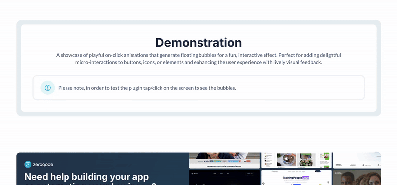 It adds an animated bubble effect wherever the user clicks-creating a visually engaging experience without coding.