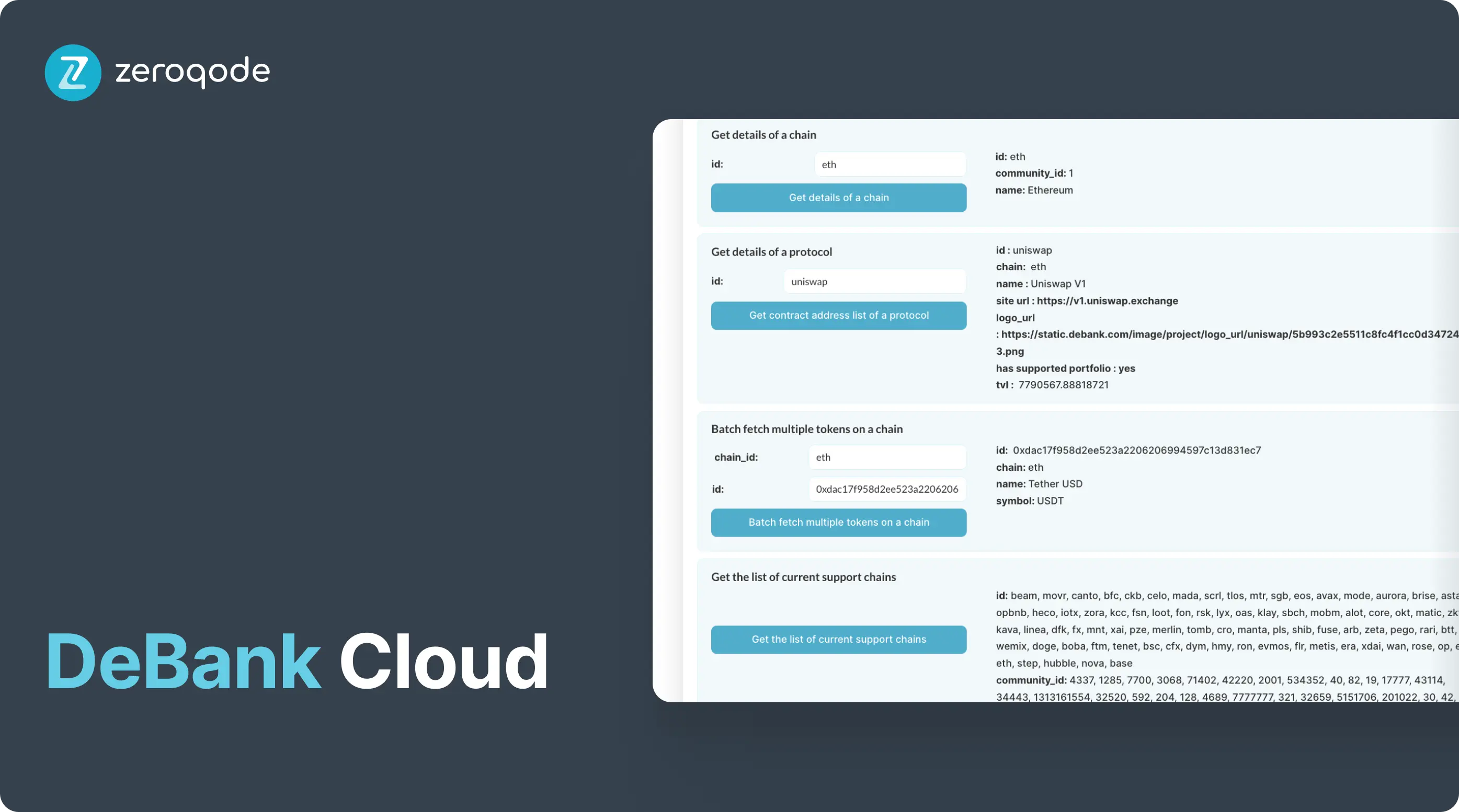 Experience seamless connectivity to the decentralized finance (DeFi) universe with our DeBank Cloud Plugin. This powerful tool establishes a direct link to the DeBank cloud, a multi-chain portfolio tracker renowned for supporting an extensive array of DeFi protocols. Enjoy effortless and swift access to individual DeFi portfolios, coupled with real-time data on users, protocols, tokens, and more.