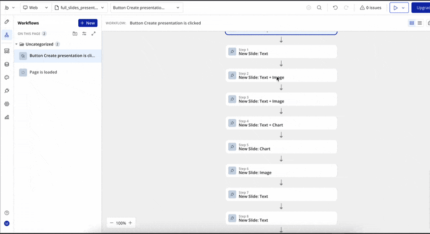 • ✍️ Design your template – Define slides (text, images, charts) and customize backgrounds, fonts, and layouts using Bubble’s editor.