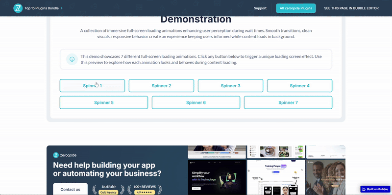 This plugin lets you add a fullscreen animated loading spinner with a customizable mask to your Bubble app. It provides a visual indicator while your app loads data or elements.