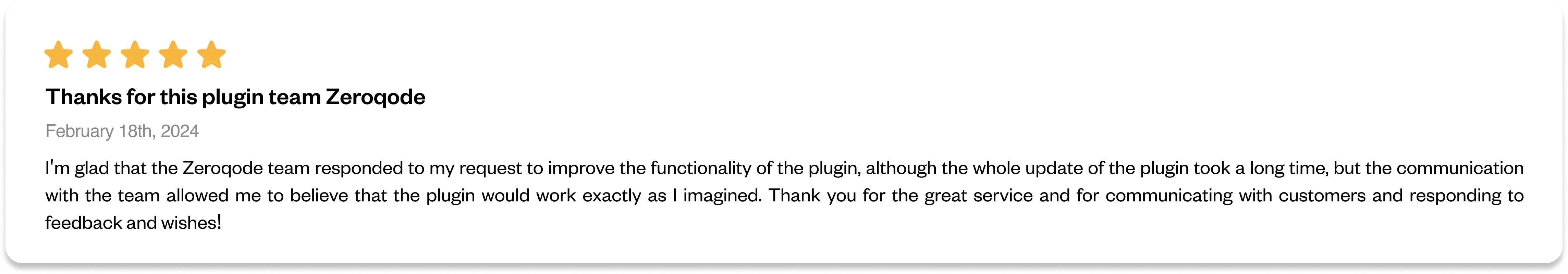 I'm glad that the Zeroqode team responded to my request to improve the functionality of the plugin, although the whole update of the plugin took a long time, but the communication with the team allowed me to believe that the plugin would work exactly as I imagined. Thank you for the great service and for communicating with customers and responding to feedback and wishes!