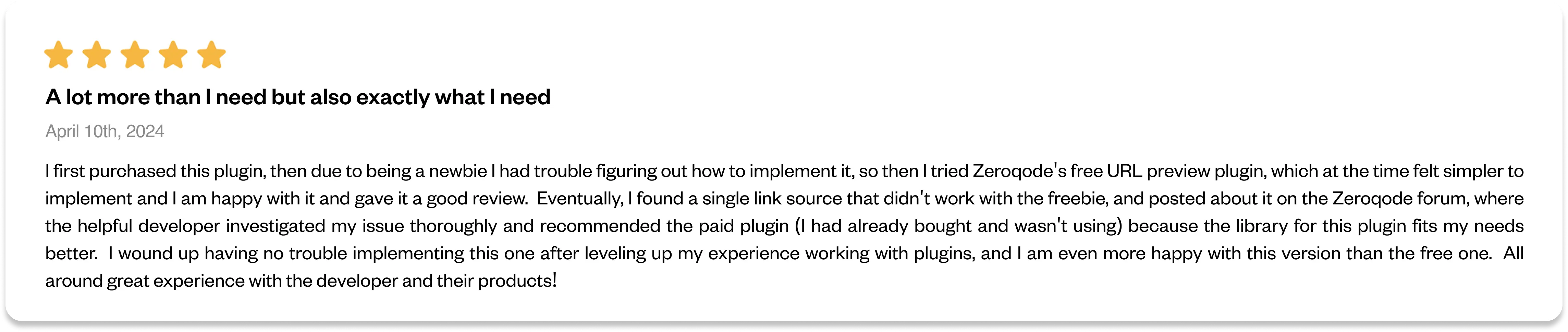 I first purchased this plugin, then due to being a newbie I had trouble figuring out how to implement it, so then I tried Zeroqode's free URL preview plugin, which at the time felt simpler to implement and I am happy with it and gave it a good review. Eventually, I found a single link source that didn't work with the freebie, and posted about it on the Zeroqode forum, where the helpful developer investigated my issue thoroughly and recommended the paid plugin (I had already bought and wasn't using) because the library for this plugin fits my needs better. I wound up having no trouble implementing this one after leveling up my experience working with plugins, and I am even more happy with this version than the free one. All around great experience with the developer and their products!