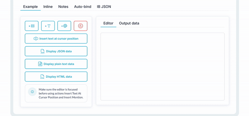Create rich, block-based content with mentions, file and image uploads, inline formatting, JSON/HTML export, read-only mode, auto-binding, image compression, privacy controls, and multi-language support.
