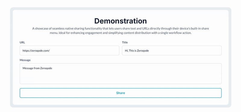 It enables your app to invoke the device’s native sharing interface through a workflow action, allowing users to directly share text and URLs from your Bubble app.