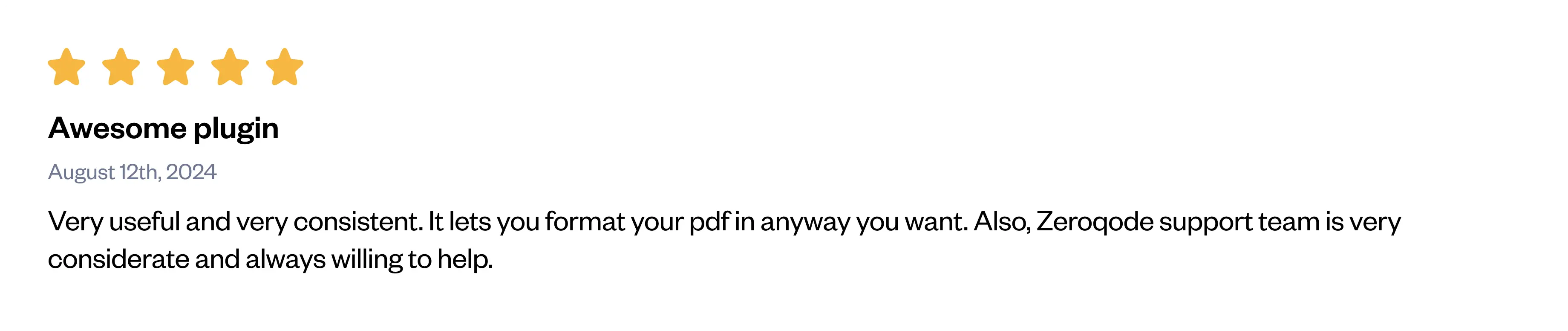 Hello, It’s Anton, from the Zeroqode Support Team. We want to extend our heartfelt thanks once again for taking the time to leave a review. Your feedback is invaluable to us and we are pleased to know that the plugin satisfies your requirements. At Zeroqode, we always prioritize our users, and if there's more we can do to make our clients happy, we're eager to do so. If you have any more suggestions or questions, or if there's anything else you'd like to discuss, please don't hesitate to reach out to us on the forum (https://forum.zeroqode.com/) or directly at [email protected]. Wishing you the best, Anton