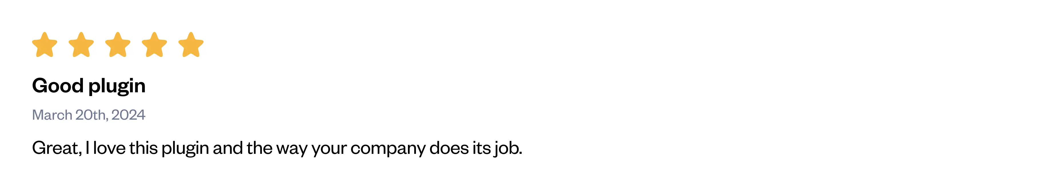 Greetings, This is Anton from the Zeroqode Customer Support Team. Thank you once more for sharing your thoughts with us through your review. Your input is truly valuable and we're thrilled to hear the plugin meets your needs. At Zeroqode, customer satisfaction is our top priority. Should you have any further suggestions, questions, or any topic you wish to discuss, feel free to connect with us via our forum (https://forum.zeroqode.com/) or directly through [email protected]. Best wishes, Anton