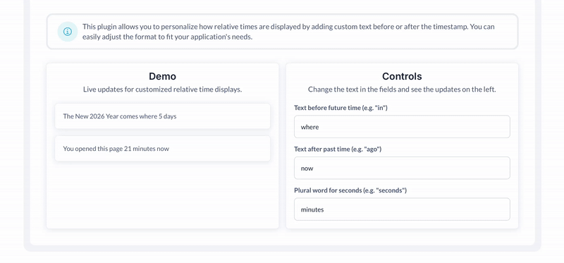 Can I customize the language and formatting?Yes, you can translate the time expressions and customize singular/plural forms and suffixes for different languages.