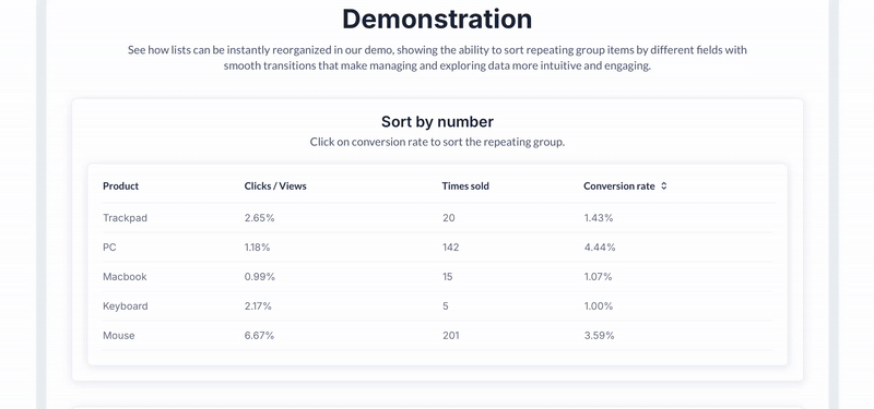 Sort items inside repeating groups by number, date, or text. Control the order dynamically to build sortable lists and tables with clear, structured data display.