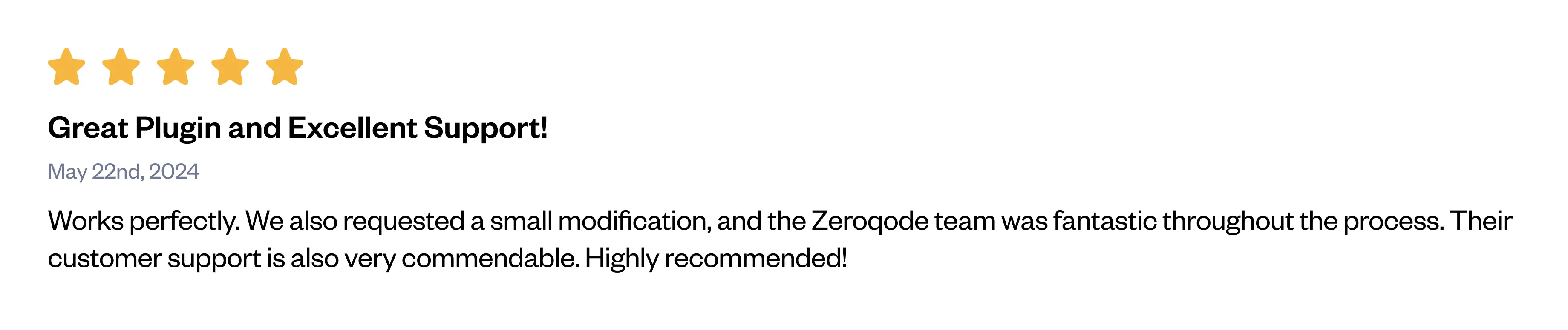 Greetings, This is Anton from the Zeroqode Customer Support Team. Thank you for sharing your thoughts with us through your review. Your input is truly valuable and we're thrilled to hear the plugin meets your needs. At Zeroqode, customer satisfaction is our top priority. Should you have any further suggestions, questions, or any topic you wish to discuss, feel free to connect with us via our forum (https://forum.zeroqode.com/) or directly through [email protected]. Best wishes, Anton