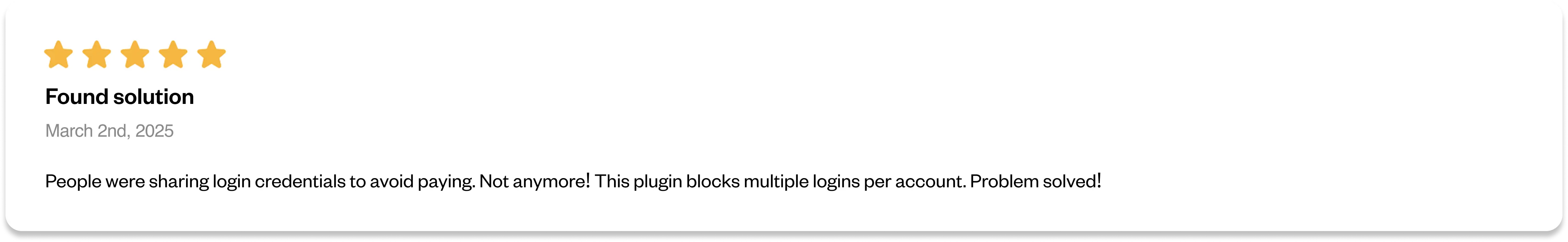 People were sharing login credentials to avoid paying. Not anymore! This plugin blocks multiple logins per account. Problem solved!
