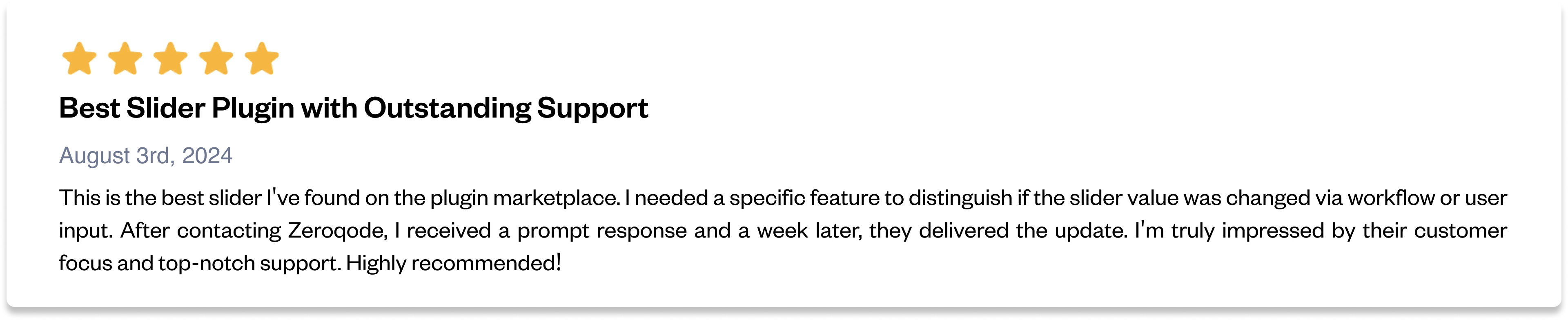 Greetings, This is Anton from Zeroqode Support. We're extremely grateful for your review and happy to see that our solutions are up to your standards. Our mission at Zeroqode is to prioritize our users and their satisfaction. If you have suggestions or questions, or if there's anything specific you'd like to discuss, we invite you to reach out via our forum (https://forum.zeroqode.com/) or email ([email protected]). Best wishes, Anton
