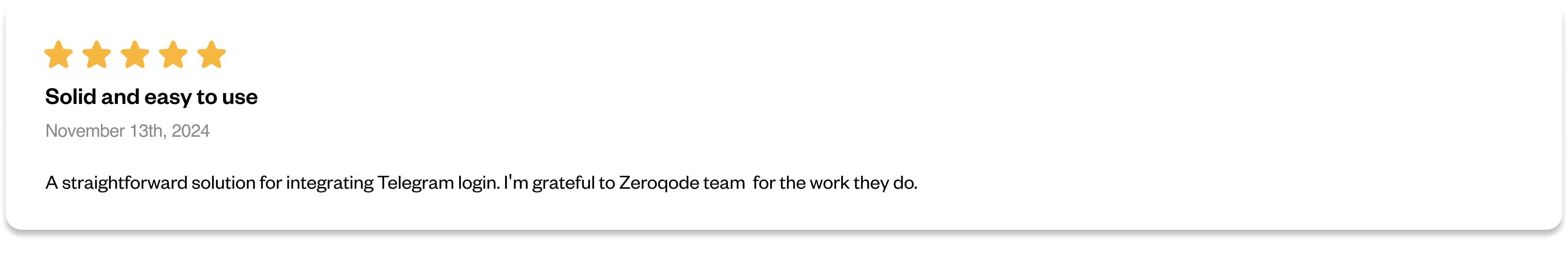 A straightforward solution for integrating Telegram login. I'm grateful to Zeroqode team for the work they do.