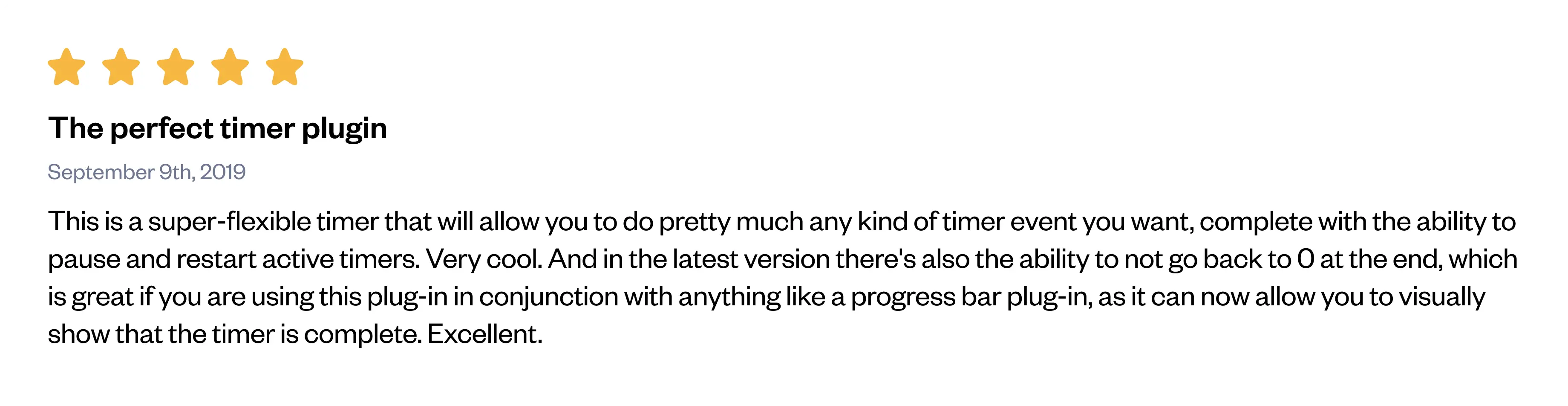 This is a super-flexible timer that will allow you to do pretty much any kind of timer event you want, complete with the ability to pause and restart active timers. Very cool. And in the latest version there's also the ability to not go back to 0 at the end, which is great if you are using this plug-in in conjunction with anything like a progress bar plug-in, as it can now allow you to visually show that the timer is complete. Excellent.