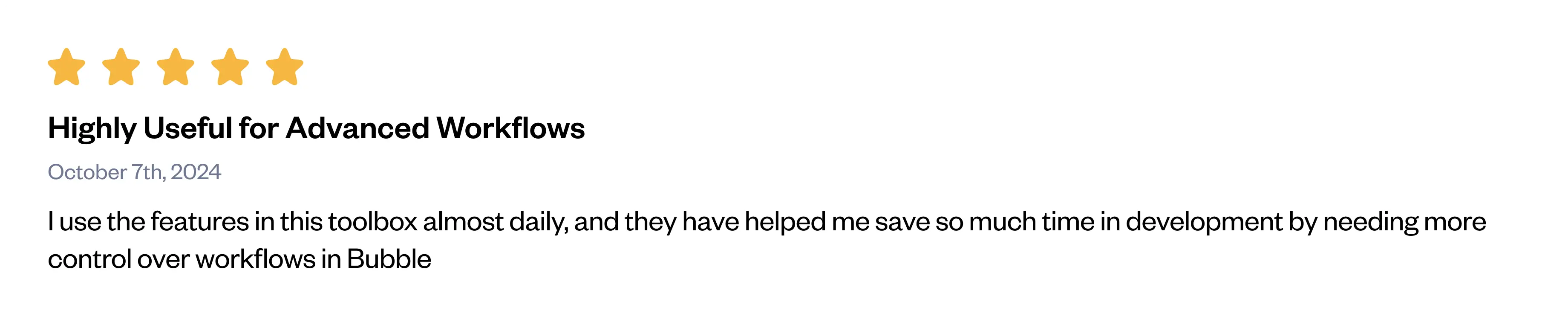 I use the features in this toolbox almost daily, and they have helped me save so much time in development by needing more control over workflows in Bubble