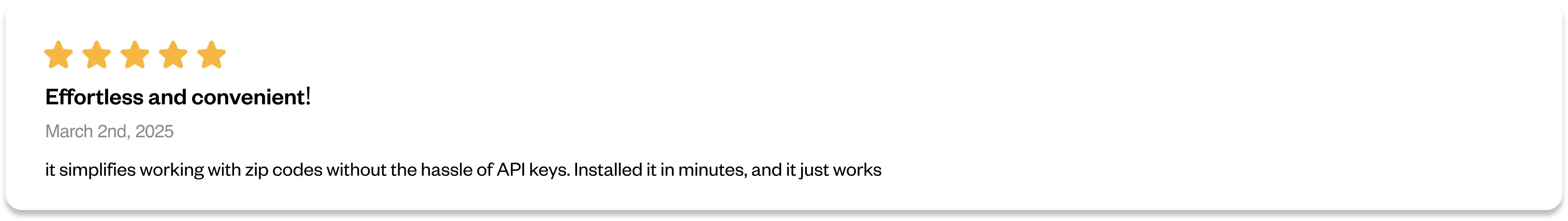 it simplifies working with zip codes without the hassle of API keys. Installed it in minutes, and it just works