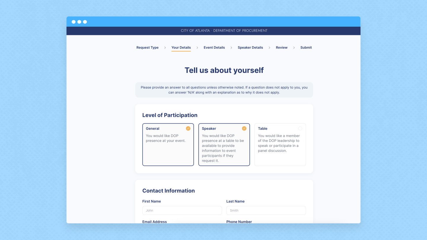 Justin had been working with the City of Atlanta’s Department of Procurement for the past year, brainstorming ways to update and streamline their very manual operations. Come late November 2023 — one month after BubbleCon — and the teams were hard at work developing their first Bubble app for the city. By early January 2024, it was officially live.