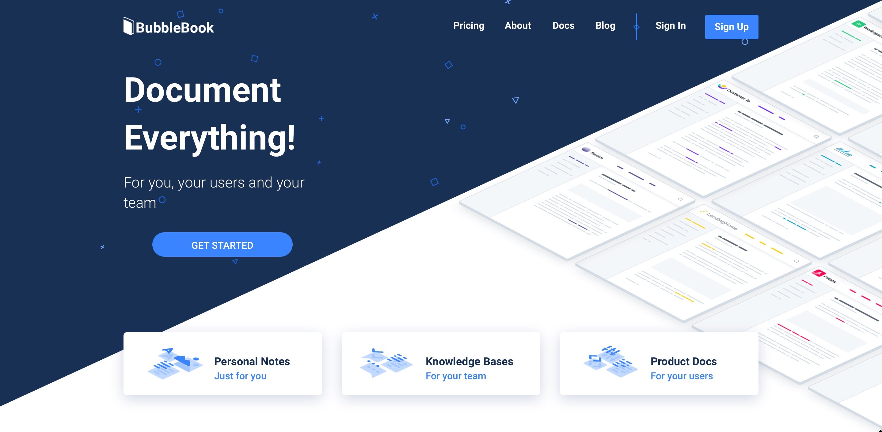 Screenshot demo of the GitBook Landing: BubbleBook template.