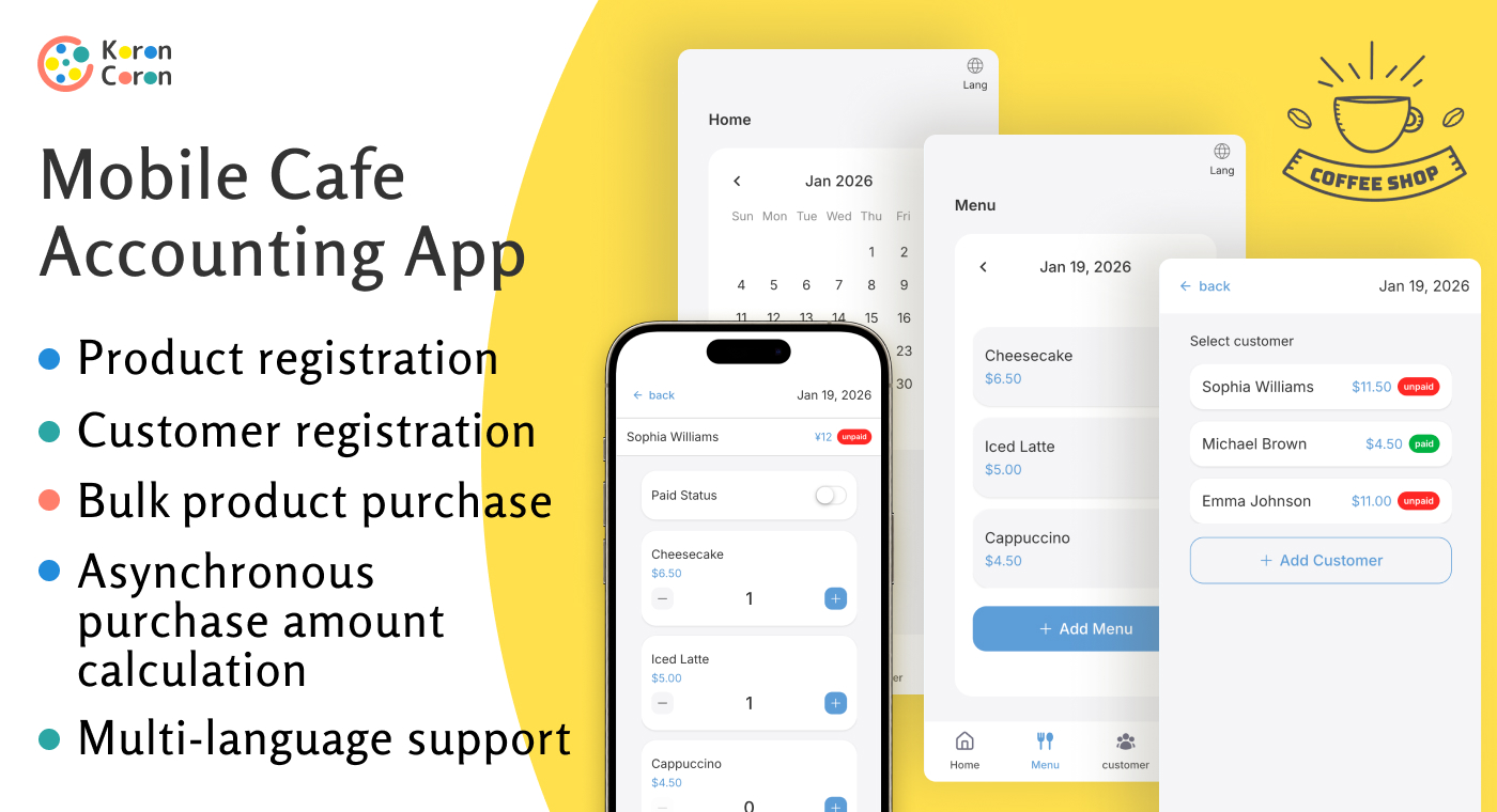 This is a mobile-first cafe accounting template to manage products, customers, bulk purchases, and payments with multi-language support.