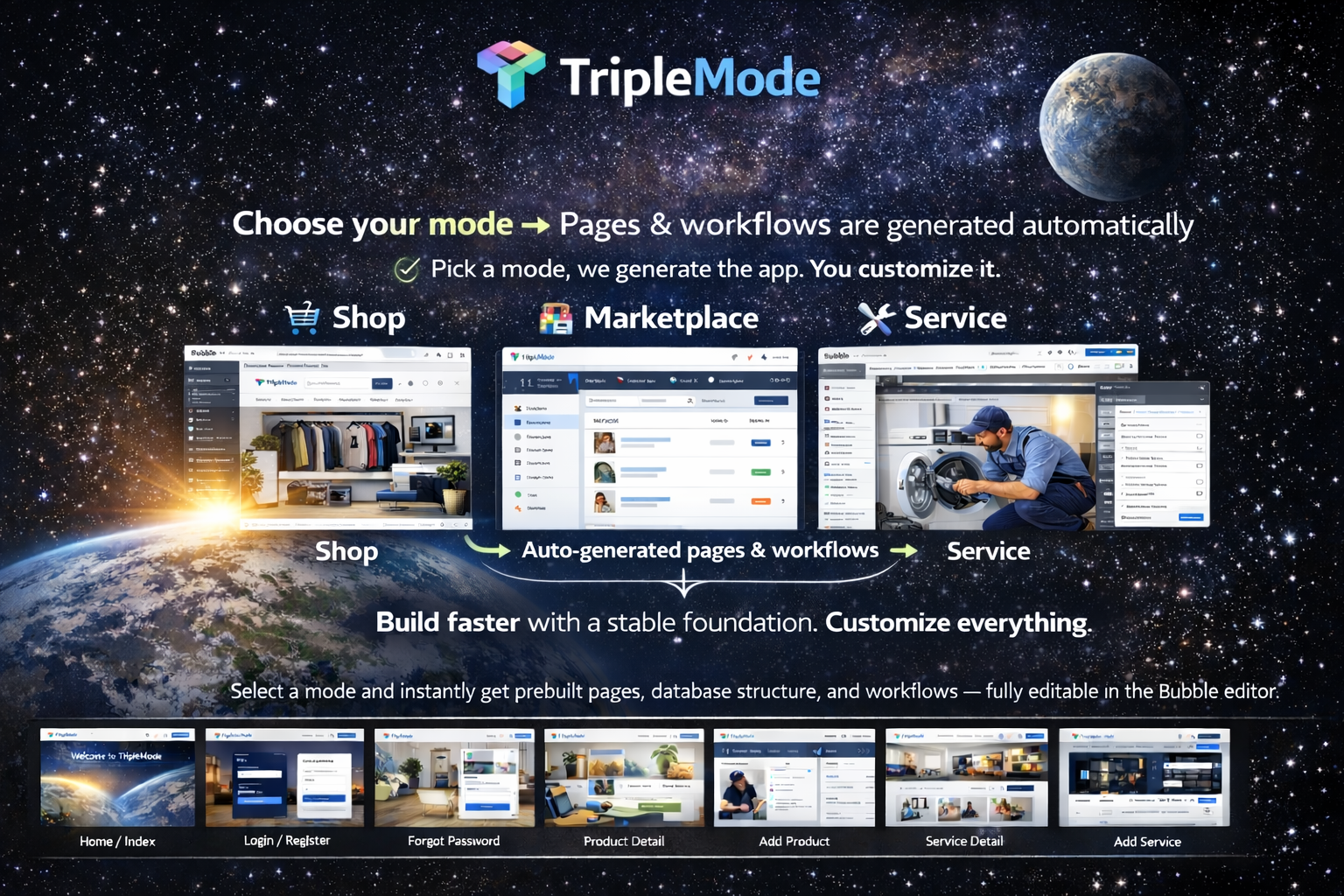 TripleMode is a 3-in-1 Bubble template for Shop, Marketplace, or Service apps.